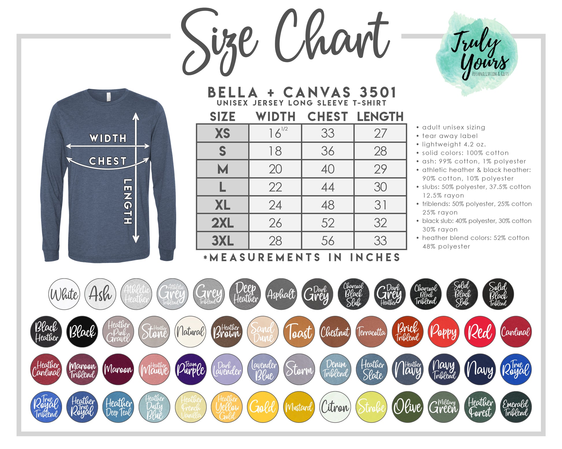 • We use ultra soft, heathered and solid Bella + Canvas shirts in a variety of colors.